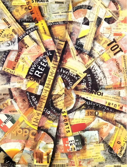 这一幅《爱国主义的庆祝会》(又名《自由单字绘画》)是追随诗人马里内蒂的发明,用"自由单字"的组成形式取代他的"自由诗句"的形式。目的是让观者通过视觉和联想,使之产生无意义、无逻辑的生活联想。为了达到这种"绘画"目的,他采用拼贴方法。所以这幅画上的"形象"都是一些各种报纸和有文字的印刷品的拼贴物。再用颜色把它们组合起来,形成信息的旋体,使其有动感。