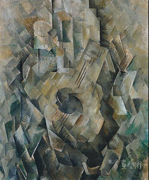 相对说来,布拉克在画中对于物象的分解,要比毕加索更加极端。他多数是在静物画中进行这种分析形体的实验。这也许是因为静物画对他说来较少约束之故。在《曼陀铃》这幅静物画中,那个被形与色的波涛团团包围的乐器,隐没在块面、色彩与节奏的振颤中,所有要素都与那具有音响特质的阴影、光线、倒影等产生共鸣。整个画面布满形状各异的几何碎块,我们几乎找不到一点空着的地方,也找不到一点不具动感的区域。那四处弥漫的光,那些朝着这个或那个方向倾斜的块面,相互之间彼此呼应。正如布拉克在一本书中所描述的那样:“回声应随着回声,所有一切都发出了共鸣”。而真正能够使众多视觉要素统一起来的,则要算是画面中心的曼陀铃上那个圆孔;这个深色的图形也是画中所有交叉的斜线所交会的中心。
