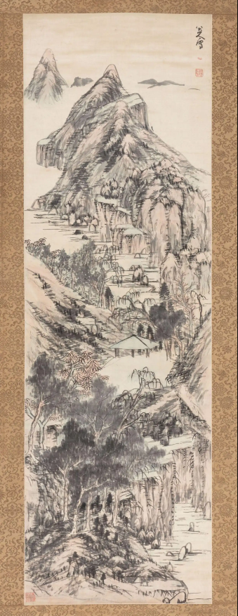 《彩笔山水图》为清代画家朱耷(号八大山人)创作的纸本浅设色山水画立轴,纵154.9厘米,横49.3厘米,现藏于日本大阪市立美术馆。该作品创作于其70岁后,融合董源、倪瓒及董其昌等前代画家技法,构图采用俯视视角,以“S”形布局展现山峦起伏,远景云雾隐现峰岫,近景碎石与水波纹路清晰可辨 。