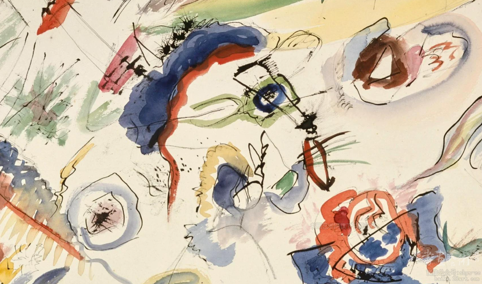康定斯基的传记作者格罗曼在谈到他该阶段的作品时,曾以哲人的口吻说道:“康定斯基所见的世界,是一个力的宇宙,摆脱了感官印象的桎梏,从外物及其实质上分离开来,并依其周围的造型而获得经验。”(何政广主编《康定斯基》,河北教育出版社,第104页)。在康定斯基这种半抽象的绘画里,所有形态都高度变形。客观的物象几乎消失在那些颤动的形体和耀眼的色块中。故事及风情的描述,在这里几乎可有可无。然而整个画面却充满韵律。那丰富而生动的画面结构,显示出画家对于内在情感及某种宇宙精神的追求。