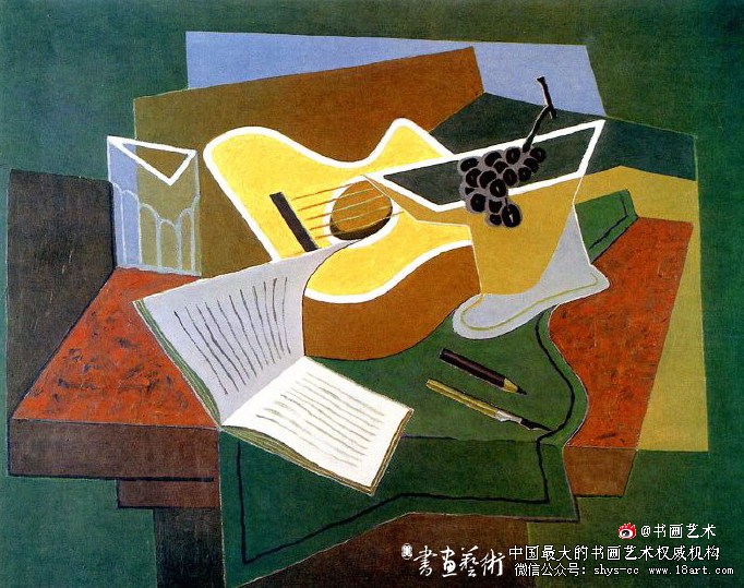 格里斯1926年所作油画《吉他与乐谱》,充分显示了他的这种“立体主义空间与文艺复兴的空间(即写实空间,笔者注)完满的结合”。在这个画面上,所有物象都被高度地简化,吉他、乐谱、桌子、台布及窗户等,在画中均显示为几何形的大色块。…—方面,它们作为基本的色块,按照某种数学关系在画面上组成完整而严密的伞间结构,另一方面,则又显现为一个由客观物象所构成的现实空间。在色彩上,画家采用不同明度与纯度的红色、赭色和棕色作为深色块,将乐谱、吉它及窗户衬托得明亮而夺目。在这个和谐统一而富于节奏的色彩构成中,格里斯通过几何化的图形,创造了一个既具有三维空间幻觉,又充满平面感的绝妙画面。通过这幅画,可以看出格里斯的晚年创作对于往昔的庞贝壁画、枫丹白露画派以及古典画风的崇尚与追寻。
