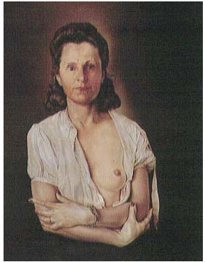 这幅名为《加拉丽娜》的加拉肖像,则表达了他对弗洛伊德性心理意识的揣测。一个木然前视的中年女性,露出自己的一只乳房,左肩上衣被撕破,她瞪大了满足的眼睛