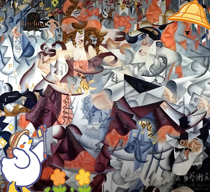 《塔巴林舞场有动态的象形文字》是塞维里尼作于1912年的一件代表作,该作品展示了其未来主义绘画的特点:立体主义手法及巴黎夜生活题材。我们看到,画家以立体主义的分解手法画出许多多面体,这些多面体在不断变化的曲线中跳跃,使画面充满未来主义所追求的运动感。闪烁的强烈色彩,形成富有节奏的韵律,这是对画面动感的进一步强化。一些细节,让我们想起立体主义的实践:缀在裙子上闪闪发光的金属圆片,精心描写的单词VALSE(华尔兹)、POLKA(波尔卡)、BOWLING(保龄球)。