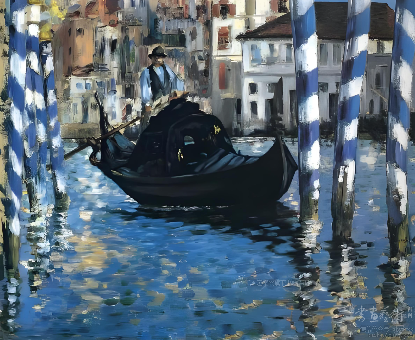 马奈(Edouand Manet,1832-1883)是十九世纪法国具有创新精神的画家。他是古典传统的革新者,具有独特的画风,他的许多著名代表作(如《草地上的午餐》)都不是印象派的画法。据说在1874年以后,他才开始探索“外光作业”。这幅画就是采用印象派画法的代表作。作品描绘威尼斯的运河景色,一艘贡多拉小船行驶在运河中。画家着重表现阳光下河水颤动闪烁的波光,和远处建筑物及近景水上座标的耀眼光彩。尤其作者运用船与周边环境的强烈色彩对比,以及那断断续续生动而率意的笔触,既表现出大自然的本色结构,又表答出一种轻快的情趣,令人赏心悦目。