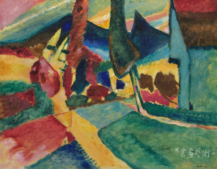 画面呈现了一个浓烈而富于对比的色彩组合。那横贯画面的条状色块,与垂直的树干呈十字形交叉,远景的栋栋房舍,色点斑斑,有如乐曲中跳动的音符。可以看出,画家在这里对于景物的描绘并不十分在意,而似乎更关注于画面本身的表现力,关注于那色彩、块面、线条的组构秩序。画面简约而富于装饰性的图像,以及那种平涂勾线的造型语言,使人想到高更和野兽派的画风。康定斯基对于绘画的精神性及音乐性的强调与重视,在这里得到充分的体现。