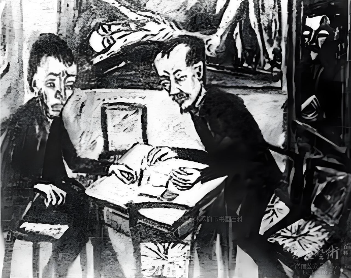 《桌边二男子》是德国表现主义艺术家埃里希·赫克尔创作的油画。作为桥社创始人之一,赫克尔通过几何化人物造型与强烈情感表达,践行其“内在需要”的艺术理念。画面呈现室内场景中两位男子的戏剧化对话:右侧男子身体前倾似在倾诉,左侧男子双眉紧蹙呈现痛苦神态,背景墙面的基督蒙难图暗示着作品的悲剧性内核。粗放笔触与沉闷色调塑造出饱受精神折磨的人物形象,这种孤寂者主题与陀思妥耶夫斯基《卡拉马卓夫兄弟》中描绘的精神困境形成文学呼应,使画面具有小说插图般的叙事张力。