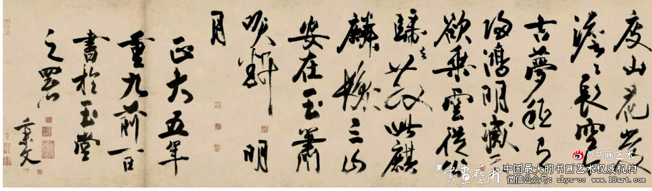 此作于金哀宗正大五年(1228年)创作, 赵秉文时年69岁,书风成熟,已进入“人书 俱老”的境界。然而这幅作品却不是纯技巧 的堆砌和卖弄,反而有着鲜明的个性和澎湃 的激情,洋溢着蓬勃向上的活力,能以纯朴 的真诚和鲜活的生命脉冲拨动读者的心弦。 只是从字里行间,我们能看到作者高屋建瓴 的气魄和驾轻就熟的智慧,充分展示了作 者的非凡功力。故而元好问评价赵书:“如 本色头陀,学至无学,横说竖说,无非般 若。”