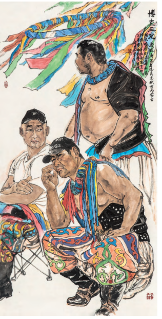 要怎样才能真切而生动地把如此丰富广阔的草原生 活和他的所见所感尽情表现出来呢?多彩多姿的生活情态,特别是人物的肖像特征和精神风貌,包括对他所热爱的马、 牛这样在他眼中充满神性的草原动物的描绘,他都尝试用各种材 料——绢、皮纸,多方探索各种具有不同性能、美感的技法—— 线条和色彩方法,淡彩或重彩,创作出大量表现草原牧民生活的 可圈可点的工笔画作品。我们从他历年创作的作品中,可以充分 领略到其丰富的创作成果。 怎样是“写意”?且不必在定义上兜圈子,我们可从经验 中的常识来把握。白石老人诗云:“青藤雪个远凡胎,老缶衰年 别有才。”