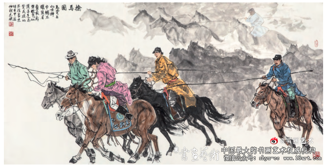 应当看到,从他个人生活经历出发而走上的国画创 作道路,从一开始便命定地需要面对生活中最难描绘的 无比繁复的表现对象——从人到马到牛羊等各种动物, 何况还有那么广阔而又丰富多彩的草原生活背景,要从 这里开始他的创作生涯,能有如此的勇气、魄力和抱 负,就非常令人敬佩了!而他要解决的课题何止是“写 真”“状物”?