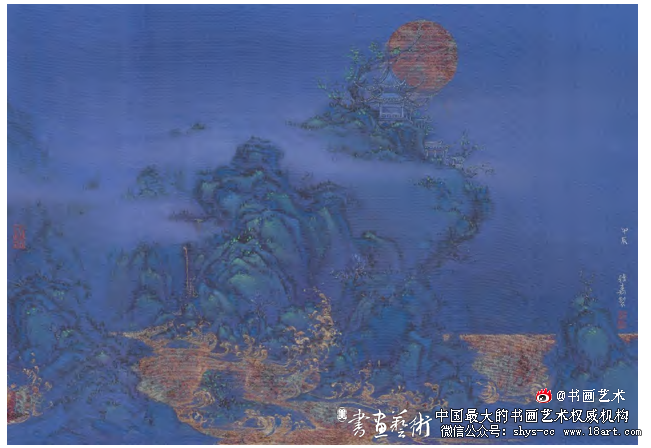 近两年我画了这座山三次,之所以一直画它,一方面因 为熟悉,提笔脑海中就会涌现出很多镜头,另一方面回忆久 远,它的样子又隔了层想象的滤镜。《楚水No.8》侧重表现 登上西塞山顶后看到的江水滔滔,我着重刻画山顶的望江亭 和山脚江水翻腾的样子,其中江涛拍岸的部分,我用烧银箔 的幻色表现出江水在月色下的华光。