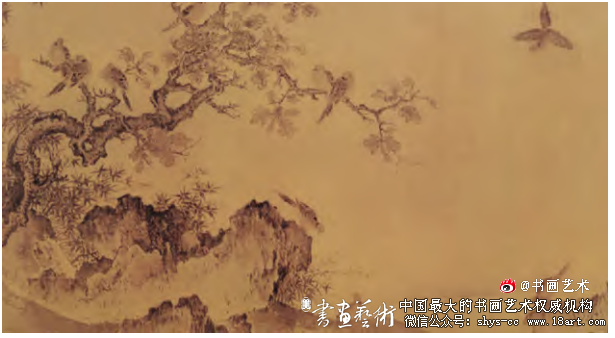 画面中的锦鸡在中国传统文化中象征吉祥,与竹石组合在一起,就形成了一幅象征富贵吉祥、寓意深远的画作。该画作内容以河岸边嬉戏的群鸠为主,画面左侧树干盘曲,枝叶婆娑。画面用墨以淡为主,不仅体现出“黄家富贵”的特点,又保持了温和淡雅的格调。