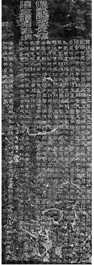 《张迁碑》,立于东汉中平三年(公 元 186 年),为谷城旧吏韦萌等为张迁 立的去思碑。碑高 292 厘米,宽 107 厘米,厚 20 厘米。碑阳文 15 行,满 行 42 字,凡 567 字,字径 3.5 厘米, 隶书。碑阴刻立碑官吏 41 人衔名及出 资钱数,计 3 列 41 行 323 字,字径 3.5 厘米,亦隶书。额篆“汉故谷城长 荡阴令张君表颂”,竖列 2 行 12 字, 字径 9.5 厘米。