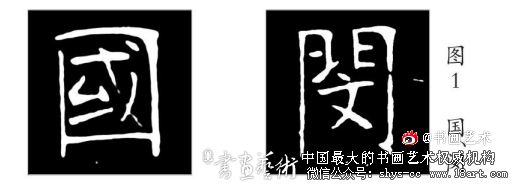 南宫碑体的字体结构呈现出内圆外方,方中带圆,方圆互为补充的特点。字的内部空间较为 圆润、柔和,线条婉转流畅;而外部轮廓则较为方正、规整,给人以端庄稳重之感。这种结构特 点使每个字都具有独特的形态,同时又保持了整体上和谐统一的美感。例如,《南宫碑》中的“国” “闵”(图 1)等字,内部笔画紧凑、圆润,外部边框方正、坚实,形成了鲜明的对比,展现出独 特的艺术魅力。