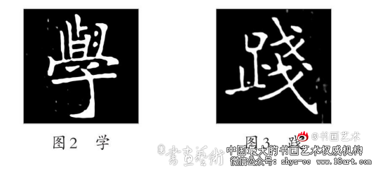 在字体结构的布局上,南宫碑体注重疏密关系的处理。笔画密集处紧凑严谨,毫不松散;笔 画稀疏处则空灵疏朗,给人以透气之感。通过疏密的巧妙安排,使字体产生虚实相生的艺术效果, 增强了作品的节奏感和韵律感。在一些上下结构的字中,上部笔画紧凑,下部笔画舒展,例如《南 宫碑》中的“学”字(图 2),上半部分紧密相连,而下半部分的“子”则笔画舒展,使整个字既 稳定又富有动感;左右结构的字,如“践”字(图 3),左边的“足”部紧凑内敛,右边的“戋” 部则较为舒展,左低右高,相互呼应,形成了一种动态的平衡。另外,从整体布局上看,《南宫 碑》的字与字、行与行之间相互呼应,气韵贯通。字距和行距适中,既不过于紧密,也不过于松 散,使得整篇作品看起来整齐而又灵动,具有强烈的节奏感和韵律感,展现出高超的书法布局技 巧。
