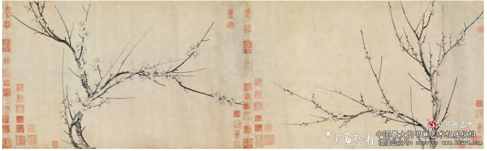 《南枝春早图》在技法层面也展现出显著突破,王冕独创“铁线圈花法”,以刚劲线条勾勒花瓣,在枝干、点苔等方面也处理精妙,并通过飞白、撞墨技法实现了枝干浓淡平衡,结合绢本“倒晕”渲染,形成湿润厚重的视觉效果。结合题跋钤印的统一形式、历史文献佐证,以及画面细节与王冕理论的一致性,《南枝春早图》可被确认为真迹,其作为元代文人画发展的关键样本,对理解墨梅技法演变与文化精神传承具有不可替代的研究价值。