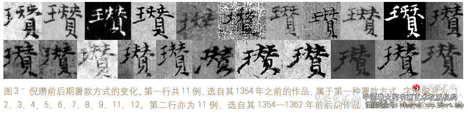 图 3ˉ倪瓒前后期署款方式的变化。第一行共 11例,选自其 1354年之前的作品,属于第一种署款方式,字例编号为:1、 2、3、4、5、6、7、8、9、11、12。第二行亦为 11 例,选自其 1354—1362 年前后的作品,属第二种署款方式,编 号为:13、14、15、16(2 例)、19、20、21、22、24、25。其中,编号对应的是附录 1 中倪瓒书法作品的顺序编号, 每一编号代表一件具体作品,以便读者查阅出处并对照分析。需要特别说明的是,编号 13 所对应的《云林春霁图》 (1354),为倪瓒首次采用后期署款结构的书迹,可视为其署名风格发生转变的关键节点