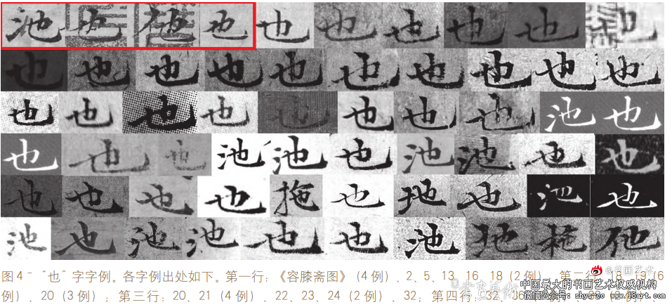 图 4ˉ“也”字字例。各字例出处如下。第一行:《容膝斋图》(4 例)、2、5、13、16、18(2 例);第二行:18、19(6 例)、20(3 例);第三行:20、21(4 例)、22、23、24(2 例)、32;第四行:32、36(2 例)、38(2 例)、 42、43、48、54、57;第五行:60、67、71、73、78、79、81(2 例)、82、83;第六行:92、93、94、99、100(2 例)、101、伪 5、伪 13(2 例)
