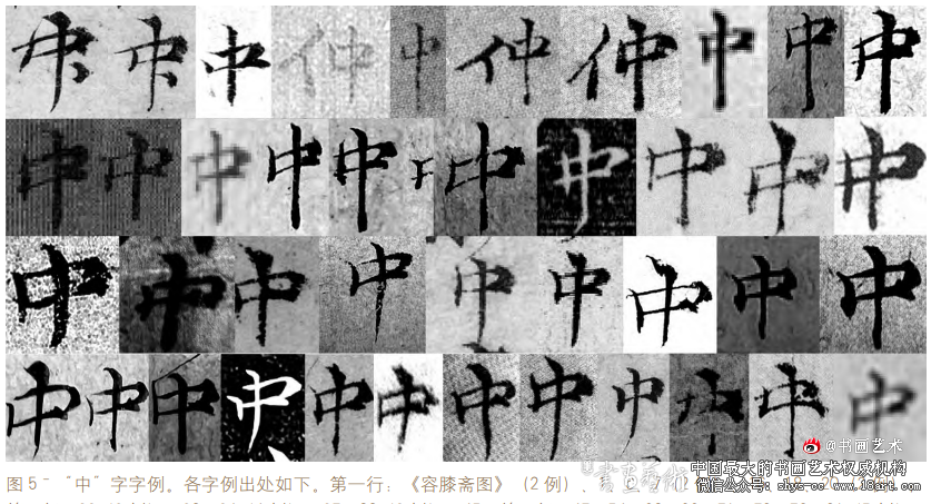 图 5ˉ“中”字字例。各字例出处如下。第一行:《容膝斋图》(2 例)、1、6、7(2 例)、16、18、20(2 例); 第二行:22(2 例)、23、24(4 例)、27、33(2 例)、45;第三行:47、54、63、66、71、78、79、81(5 例); 第四行:83、84、86、87(2 例)、96、伪 9、伪 18、伪 23