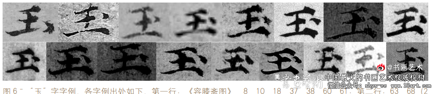 “中”字为倪瓒书迹中出现频率最高的 字之一,共收集 42 例(图 5),在各类书 作中皆保持结体的一致性,从未出现异常。 而《容膝斋图》中两个“中”字(第一行前 两字)的右下角却各多出“丶”点画,形成 异体字。此类变异虽小,却发生在结构最为 稳定的基础字中,足以引起怀疑。 “玉”字收录 17 例(图 6),其中 16 例在末笔“丶”点画与中横平齐,并与底横对齐的同时,底横均作顿挫收笔,整体字形 紧凑稳重。