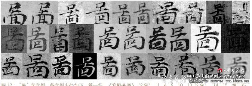 图 12ˉ“啚”字字例。各字例出处如下。第一行:《容膝斋图》(2 例)、1、4、9、10、13(2 例)、14、15;第二行: 22、31、35、39、46(2 例)、50(2 例)、53、64;第三行:75、76、81、82、86、96、伪 8、伪 18、伪 21、伪 23