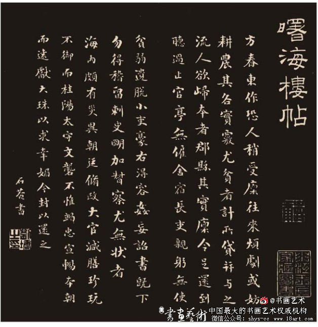 诸城刘文清公书二幅,旧藏青浦蒲褐老人家,尝刻以行世。蒲褐化去未十年,藏本散佚。有 如是者,盖可叹也。后一幅作于己未四月,是年四月,余与蒲褐皆在京师,同为极乐寺之游,有 诗纪事。 石韫玉与王寿康是师徒关系,石韫玉又出刘墉门下,所以我们也可将《曙海楼法帖》视为刘 墉再传弟子刊布的法帖。