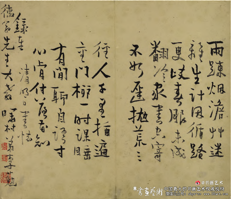 释文: 扬州博物馆藏 无端往事去如尘,那见郊原草不春。摹写重劳浮白手,行吟痛踏青人。鸳央胎托烧宫瓦,蝴蝶魂飞恋绣茵。莫怪钟情收拾尽,满前除此是荆榛。题友人春草诗册。雨疏烟澹草迷离,生计因循路更岐。春服未成翻冷,家书空寄不如迟。抛荒三径人千里,插遍重门柳一时。课睡有闲聊自语,寸心肯付落花知。清明日书怀录奉德翁先生大教啸村弟李葂。右军未与序相谋,奉勅沙门苦校讐。墨迹顿成唐代宝,霜毫犹带晋时秋。停匀字集千狐腋,贵重碑传七佛头。 一自兰亭无善本,真诠唯向此中求。跋《圣教序》。