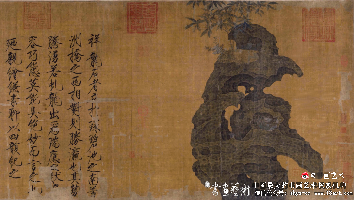在《祥龙石图卷》中,他的题画诗不在卷尾, 而是作为画面构成的一个部分, 这必定是其将构思和构图同时经 营的结果,这在中国绘画史上有 着划时代的重要意义。该卷构图 极简,用色颇精,格调雅致,具 有典型的北宋院体绘画的艺术风 格。该卷钤有元内府“天历之 宝”等印玺,拖尾有清代陈仁 涛、吴荣光的题跋,《辛丑消夏 记》有著录。