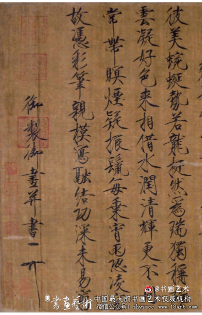 云凝好色来相借,水润清辉更不 同。常带瞑烟疑振鬣,每乘宵雨 恐凌空。故凭彩笔亲模写,融结 功深未易穷。” 款署“御制御画并书”, 押署“天下一人”,钤印“御 书”“宣和殿宝”。徐邦达先生 认为此印“不佳,真伪待考”。 在南宋特殊的历史时期,该图遭 到裁剪的可能性是有的。