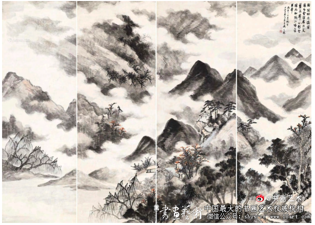 吴子深 溪树烟稍(四屏) 设色纸本 190.2cm×65.5cm×4 1965年