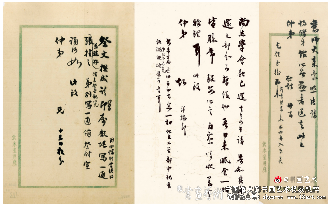 2017年初秋,夏子魁首次举办名人手札展。开幕式上, 听几位书法家再三强调手札的书法意义,我颇存疑惑。确 实,王羲之的《快雪时晴帖》《寒切帖》、陆机的《平复 帖》、王珣的《伯远帖》、颜真卿的《刘中使帖》、怀素的 《苦笋帖》《食鱼帖》……原本都是尺牍,由于在书法领域 的价值超越其他,被敬重地称之为帖。梁启超 致梁启勋信札三通三页 夏子魁藏然而仔细想想...