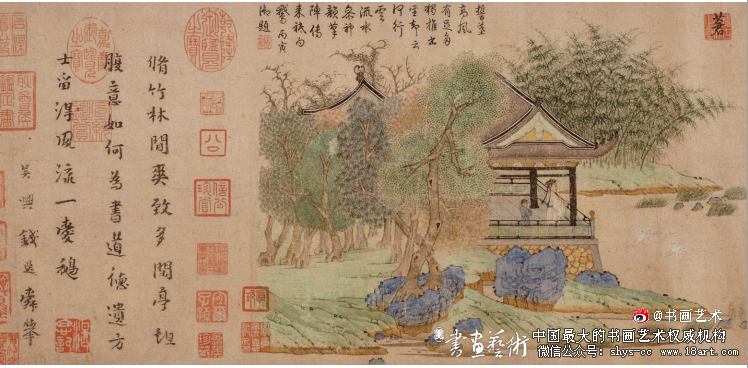 他这种 古拙的“小青绿”风格,常让人觉 得画中山水像是某种虚幻的境界, 而这恰好寄托了其寻求世外桃源的 理想,这点从他画中题诗不难看 出:“修竹林间爽致多,闲亭坦腹 意如何。为书道德遗方士,留得风 流一爱鹅。”其中,既包含了“东 床快婿”的典故,又有王羲之以 《道德经》与道士换鹅的传说。题 画小楷活泼俏皮,结字稀疏错落, 与作品清新严谨的画风相调和,画 面顿时溢出清新的书卷气。