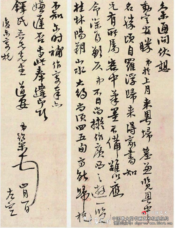此作数处渴墨枯笔,亦甚有意味。如第 2 行“中”字之一竖,起笔慢,行笔渐重,笔肚压纸, 缓缓而出,甚是厚实;如“之游一览”四字,墨尽,笔已枯,但行笔自然,笔笔沉着。特别是“览” 字之竖弯钩,信手拈来,意态飞扬。如“顿首”之最后一笔,骤然放大,笔重而粗,墨枯而渴, 势大力沉,感情激越,一往无前,打动人心。枯笔见性情,亦见功夫。