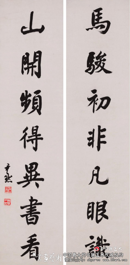 此作(如图)为行书对联,单条尺寸为纵 132cm,横 32cm,现藏台北故宫博物院。上联“马 骏初非凡眼识”,出自陆游《次韵邢德允见赠》,下联“山开频得异书看”出自陆游《梦中作》。 此作为行书,然楷意甚浓,行笔沉稳,少跳荡之笔,一丝不苟,笔笔送到,布置妥帖,雅正清丽。