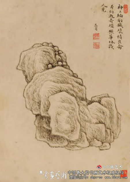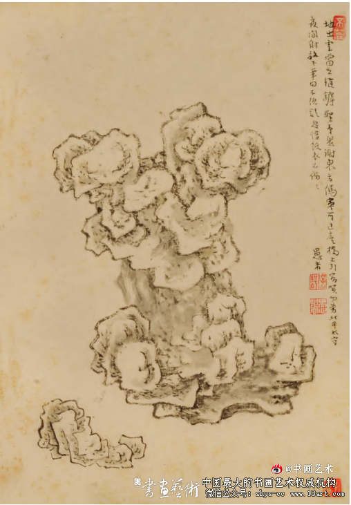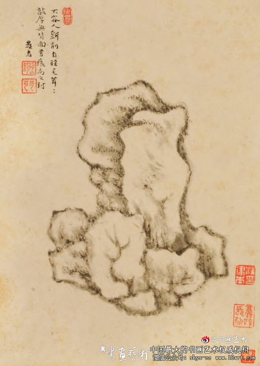 愚者搜出鸿濛骨,几笔创作珊瑚枝。蹙缩蓬莱供盆几,倾湫倒岳太儿戏。果何为?撑肠拄肚休网碑,骈指会蕞真支离!”方以智自跋为:“庚戌献岁,寒山无事,童子炙炭研墨,请愚者发笔,遂成诸种石,将谓荟撮各家,实则听冰雪之自肖耳。研邻山主过归云阁而索观,便以为饷。”最后有“芝老”题跋:“磊落形奇,峻嶒骨傲。石耶?人耶?分明写照。固由天然,亦因笔妙。为问米癫,何如九曜。甲申冬初,芝老题。”
