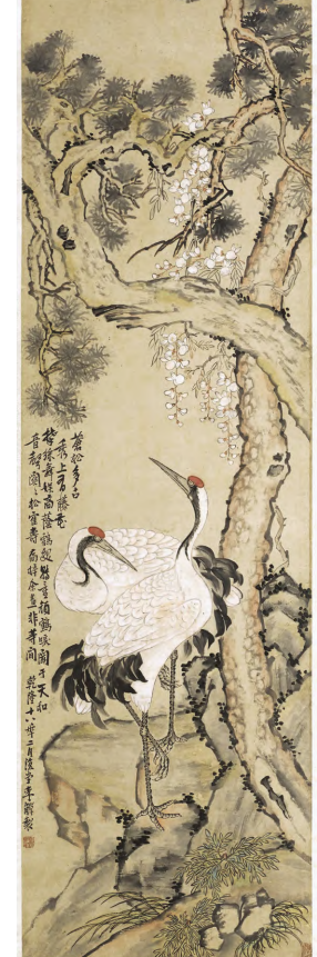 画面中两棵姿态迥异的松树皆 从右下角出势,纵横交错于画面上方并于 左上斜出:后侧松树树干以中锋打圈的笔 法表现干枯劲挺的松皮质感,微染赭色表 现阴阳向背;前方松树则以干枯淡墨、短 线条表现枝干曲折,更显无拘无束。松针 水分饱满,前浓后淡而过渡自然,用笔圆 润松快。松树间的藤花用干净的工笔画法 绘就,以白色为主,与赭色巧妙撞色,双 勾叶片缀饰其间,轻盈美好。画面下方两 只仙鹤高洁俊雅,羽毛洁白轻盈,尾羽润 中带燥。藤花之“白”与仙鹤之“白”演 绎出跨越植物与动物的色彩对话,二者相 互映照,既象征自然生命的欢愉,又代表 着文人理想的精神标高。这种跳动的白 色,是笔墨语言的创新,亦是有趣灵魂在 雅俗之间的诗意表达。