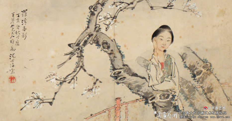 曲折的树干为园林中的仕女提供了倚靠的可能性与便利性[3],或是一手扶着枝干,一手攀梅枝,姿态生动自然,显得女子俏皮活泼。沈心海《罗浮梦影图》(图1)描绘少女独倚梅树、手托香腮、暗自神伤的情景,仕女与梅树以疏简的形象、淡雅的笔墨更好地结合在一起,婉约且美好。