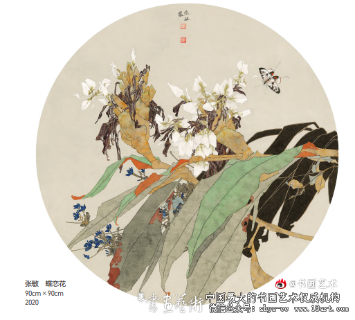 其作品《春妍》中蝴蝶形神兼备,细节精妙,精致写实,画面生动,格调高雅,韵味悠长,呈现出花叶飘香、蝴蝶飞舞、生机扑面、春意盎然的春天景象。张敏每一件作品的绘画主题都具有浓郁的时代色彩和诗意家园景象。她从主题思想和时代精神层面进行画面设计和色彩安排,让观者能从画面中感受到美好的精神向往和心灵召唤。