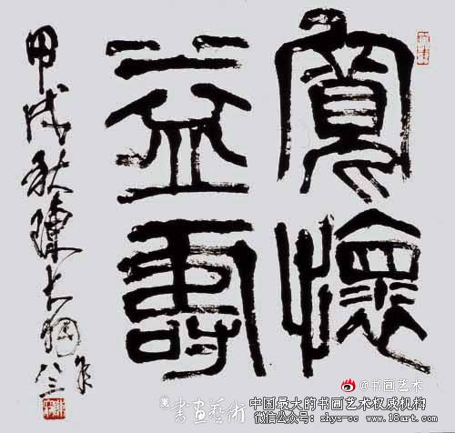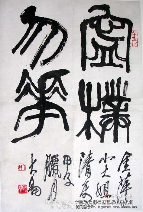 一位大写意画家的成就,说到底是画家的气质、修养、功夫、火候与人格、情操等多方面相契合的结果。陈大羽的艺术所以能远离凡俗而睥睨群侪,正是多年潜心从艺的结果。他的写意花鸟画与书法金石的修养成就分不开,和白石一样,他精于大篆,落笔雄迈,黄钟大吕,金声玉振,书画金石相得益彰,在当代画家中,尤为难得。