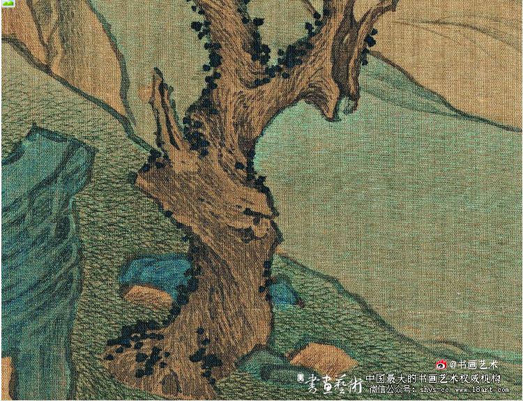 仇英《桃源仙境图》-局部高清放大明代 仇英《桃源仙境图》绢本,设色,纵:175厘米,横:66.7厘米。天津市博物馆藏 《桃园仙境图》为重彩大青绿山水,全画以竖幅高远章法,分三层叠进。画中描绘的是一个远离尘世的隐居环境。远处峰峦起伏,白云飘渺,楼阁在云雾中半藏半露,把这里点缀得如仙若幻。近处奇松倚斜虬曲,古藤盘绕,红桃掩映,景致幽雅。三个...