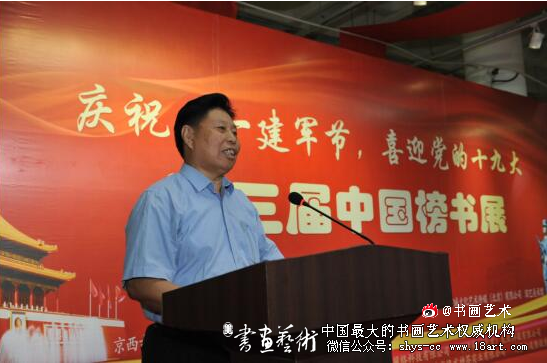 为纪念中国人民解放军建军九十周年,传承中华优秀传统文化,发展榜书艺术,由中国社会艺术协会主办,中国社会艺术协会榜书委员会等承办的“庆祝八一建军节,喜迎党的十九大”第三届中国榜书展开幕仪式,于2017年7月29日在北京国艺美术馆隆重举行。