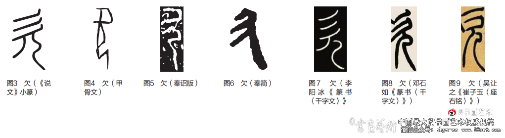 篆书中因错就错的现象一直存在,古人篆法宗于《说文》,又缺少出土资料佐证,或可理解。依据现有文字学成果,书法中继续选用经典中的讹错字是不恰当的,这也是当今书法教育亟须改进之处。《说文》中“欠”的错误早已为文字学界共知的,而很多学书者对此未有认识。虽然一些书法专业设有文字学、古代汉语等课程,但此类问题未有解决,这也从侧面反映了不同学科之间交流的缺失。