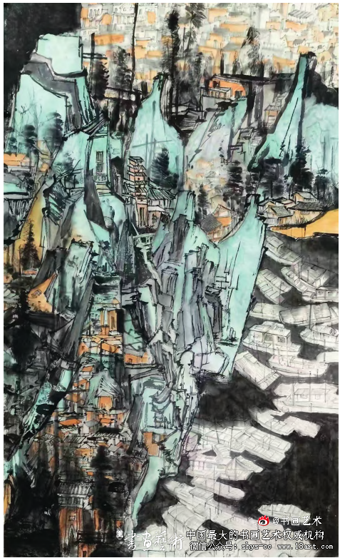 实际上,细观其近年作品,既有传统山水画的基本布局,诸如山水题材、书法题款,也有以几何形体组成的奇光异彩,带有诸多现代气息。