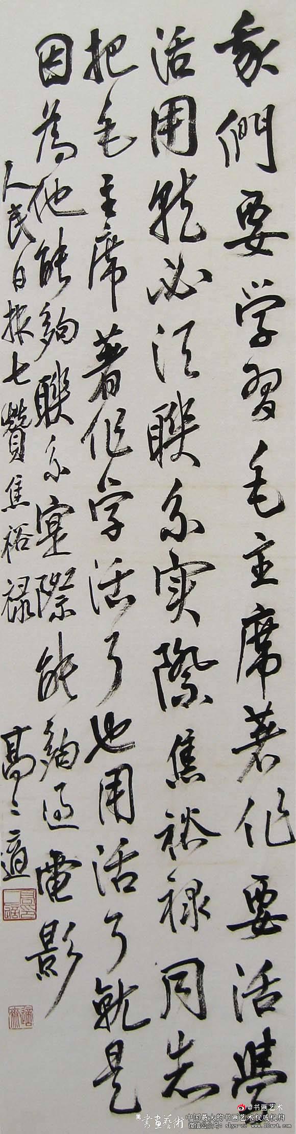 不但“一生学杜甫”,一生把诗歌当成生命,在文史哲、诗词、书法的研究和创作方面,成果卓著;而且把书法艺术当成一门学问来研究,在书法史论方面取得较高声誉。1965年参与了“兰亭”论辩,《〈兰亭序〉的真伪驳议》和《〈兰亭序〉真伪之再驳议》等文章影响很大。学书涉猎各体兼取多家。早年临《明征君碑》、《曹娥碑》、《兰亭序》、《龙藏寺碑》及钟、王法书;中年尤好王献之行草;晚年则专攻章草,醉心于《急就章》的研究,并兼收五代杨凝式、元末宋克诸家法度。章草出于隶书,为隶书连笔带草之快写;今草出于真行,为真行简快之书法。隶书扁平,而真书纵长,扁平之体必以横画垒架,而纵长之体必以竖画立间;以故隶书至重横画,真书至重竖法。以其着重所至,隶法往往横厚重而竖细弱,真书往往竖粗壮而横轻薄。用笔之刻意,亦因此而有偏向。所作师古而不泥古,攻“章”而不囿于“章”,力熔章草、今草、狂草于一炉,点画遒劲,结体多变,能于严谨中见骨力,平实中出险峻,凝重处显生动,惊矫纵横,笔随神驰,自具面貌。