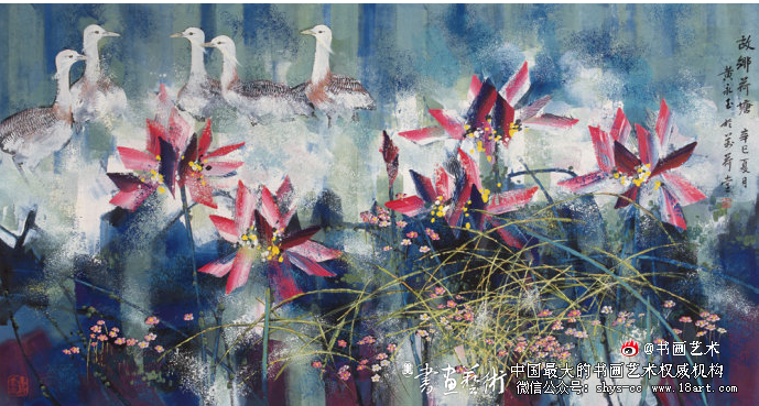 黄永玉被称为“荷痴”,不单是缘于他画的荷花多,还在于他画的荷花独树一帜,神韵盎然。国画传统讲究“计白当黑”,他偏偏来个“以黑显白”,这种反向继承不但使画面看上去主体突出,色彩斑斓,而且显得非常厚重,有力度。