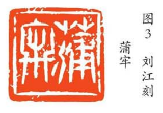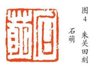 令人唏嘘的是,近 40 年光阴荏苒,名 单中的许多老一辈大师已然作古,他们在此印集中的刀痕,成为其艺术生涯珍贵的晚霞;而当年 参与的青年才俊,如今已成长为中国书坛、印坛的扛鼎人物与学术中坚。有着不同经历与经验的 篆刻家们,对茅盾的笔名有不同的理解,在作品上自然也有着不同的呈现。比如,李早刻“茅盾 笔名印集”(图 1)白文大印,以切刀法表现如汉印浑厚气象,线条如碑拓斑驳;谭建丞刻“沈德 鸿”(图 2)时,以浙派“碎刀短切”技法,在刀刃与石面的摩擦痕迹形成“涩笔”效果;刘江在 “蒲牢”一印(图 3)中,以短而利的白文铺陈线条,使印面如猛兽齿牙交错,边框刻意保留的 崩裂痕迹暗合“龙生九子,蒲牢好鸣”的神话意象,有着将文学隐喻转化为视觉符号的创作思路; 朱关田则将碑学笔法融入“石萌”一印(图 4),线条起笔如斧劈,收笔似虫蚀,使文字兼具青铜 器铭文的沧桑感与现代雕塑的力量感。 其次在对传统篆刻题材的拓展上。