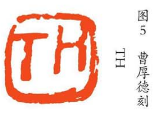 即使是 英文字母,他们依旧有着自己的审美倾向,比如曹厚德刻的“TH”(图 5)保持“疏可跑马,密 不透风”的理念,调整布局,上下高度差,左右角顶边,留出中空;刘江刻的“Y.P.”(图 6)将 两点巧妙的与边框的破损呼应,并以欹侧构建出简单字母的画面感;而马亦钊刻的“MD”(图 7) 则如汉印般工整端庄,线条稳健。