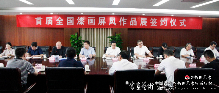“首届全国漆画屏风作品展”由中国美术家协会、江苏省文联主办,中国文联美术艺术中心、中国美协漆画艺委会、江苏省美协承办,海澜集团有限公司、海澜美术馆协办。将于2019年10月在江苏省江阴市海澜美术馆举办展览,展出入选漆画屏风作品100件,为社会积淀一批有价值的艺术作品,为人民群众献上一份艺术盛宴,为中华人民共和国建国七十周年华诞献上一份厚礼。陈金华介绍展览基本情况,佘玉奇、周建平、杨力群等分别发言,徐里对展览筹备工作提出要求。李伟和江南签定了协约意向。