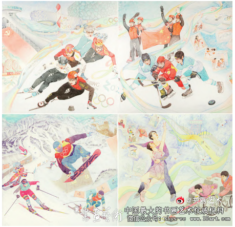 而奥林匹克运动会作为国际级的体育盛会更是吸引着国内外艺术工作者的关注。以第九届中国北京国际美术双年展为例,其中入展作品《融情冰雪 圆梦双奥》(图2)即是为迎接北京冬奥进行的主题性创作。该作品以运动员为表现主体,通过工笔形式描绘运动健儿在赛场竞技拼搏的场景,以精致入微的神态刻画与动势表现将观者引入超于现实的审美空间,沉浸式感受体育竞技中紧张刺激的竞赛氛围。同时各国健儿同台竞技的场景也喻示着当今全球化的时代背景下各国人民齐聚一堂,以体育交流为契机,在奥林匹克这一国际盛会中向着胜利共同拼搏,象征着世界共同体的和谐发展,展现了和平、友谊、团结的奥林匹克体育精神。