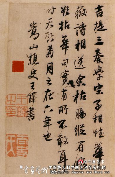王铎题跋王铎,字觉斯,一字觉之,号十樵,一号嵩樵、痴庵,又号痴价道人,孟津(今河南孟津)人。 明天启二年(1622)进士,入清官至大学士,谥文安 。高爽博学,好古,工诗古文 。行草宗二王,正书出锺繇,亦能自出胸臆,有《拟山园法贴》 。画山水宗荆、关,丘壑峻伟,皴擦不多,意趣自别 。 王铎的书法...