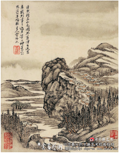 李宝章《临安山色图》中,江湖平川在云雾中若隐若现,虚与实的对比强化了平川万里之势;峰峦之巅,或隐入云层,或推至画外,更是增加了山岭崇峻之感;游客穿行于草木丰茂的林间小道,渔夫划舟于清波浩荡的水面之上,茅舍高塔点缀于深壑幽静的山谷之中……整幅画面无处不充满着生意,无不呈现出一种“曲径能通幽”“境深若贵明”的深邃意境。画中的清溪、怪石、曲桥、茅屋、高峰、幽谷等,大概就是中国山水画家向往赋闲隐居的符号与托物言志的载体。此图虽为表现临安秋色,但是画中浓浓的田园气息或许正是李宝章晚年由晚清进入民国后平静归隐心情的真实写照。